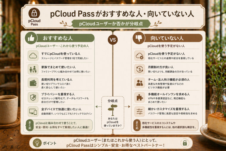 一番の理由は「pCloudとセットで完結する」こと。ストレージもパスワードも同じエコシステムで管理できるのは、他にないメリットです。