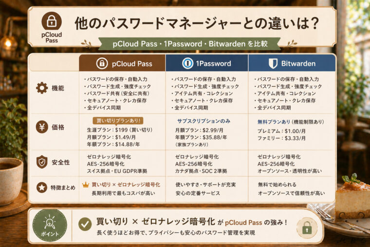 1Passwordとか無料のBitwardenとか、他にも色々あるじゃない。なぜpCloud Passを選ぶの?