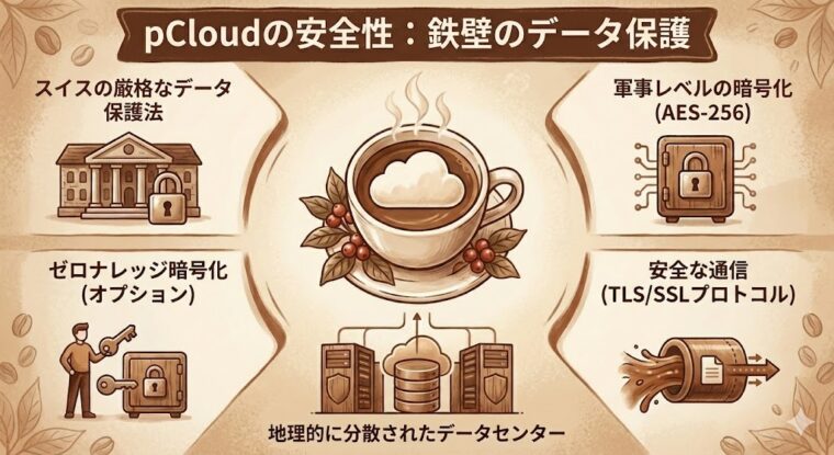 pCloudの安全性は、単なるキャッチコピーではありません。「技術」と「場所」の二重ガードで守られています。