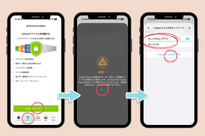 - Encryptionフォルダ: あなたのPCやスマホで暗号化してから送信。pCloud側には「グチャグチャな暗号」しか届かない。